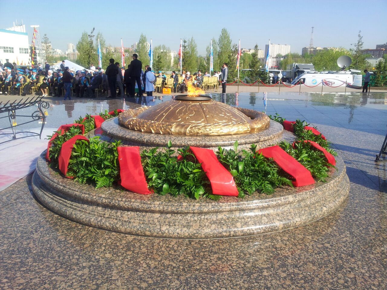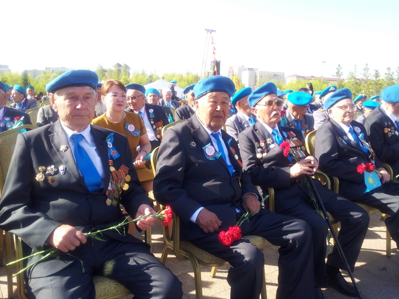 В торжественной церемонии возложения венков к монументу "Отан қорғ­аушылар" приняли участие ветераны войны и труда, премьер-министр республики, спикеры палат Парламента, руководители государственных органов, депутаты, а также жители и гости столицы, прибывшие почтить память казахстанцев, погибших в годы Великой Отечественной войны.