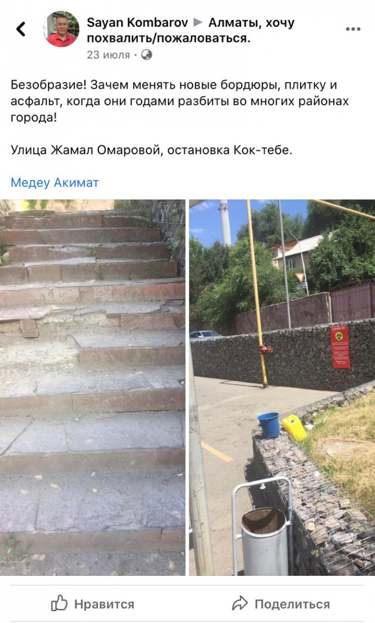 "Акимат Алматы! Вы знаете, что продолжается смена бордюров? Новых на новые. Двор дома Гагарина, 200. Может быть, хватит пировать во время чумы? Займитесь реальными делами и помощью людям", - написала Ирина Смирнова в Facebook.