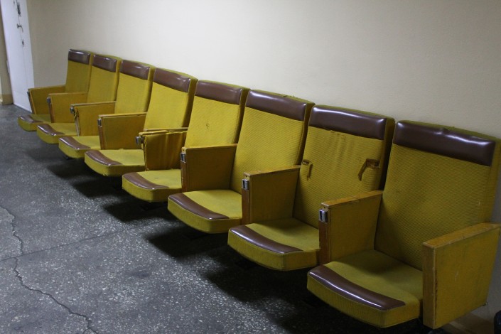 "В этом зале совещались.  Цвет стен был другой. Люстры те же. Красные кресла остались те же. Посредине стоял большой стол, который перенесли в другую аудиторию. Остался только маленький столик посередине. Столы мы списали, зачем мне они нужны? Сильно тяжелый стол, никто поднять не может, поэтому стоят внизу на складе. Еще здесь раньше была пальма у входа", - говорит Ирина Михайловна.