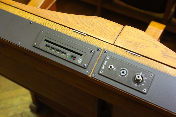 Кабинки переводов, по словам Ирины Михайловны, появились, когда в Казахстане создали двухпалатный Парламент. В самой кабинке сейчас сохранился один микрофон.