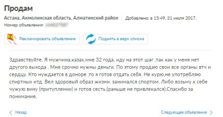 Необычное объявление было размещено 31 июля. Автор указал свой возраст и пояснил, что продает себя, так как ему срочно нужны деньги. "Кто нуждается в доноре, то я готов отдать себя (...) Возьму чужую вину", - отмечается в тексте объявления. При этом автор указал цену - 17 миллионов тенге.