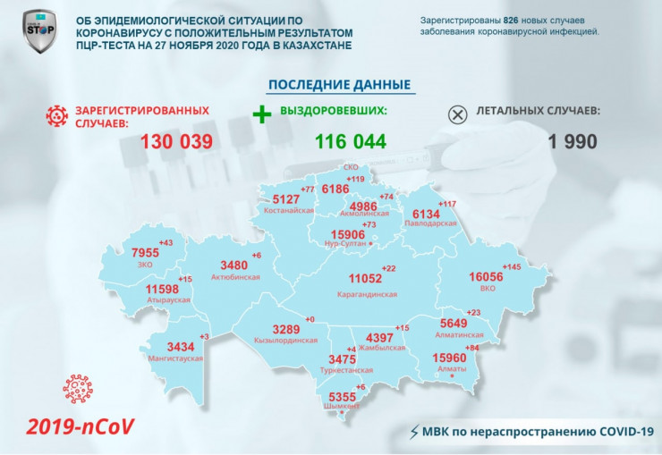 В Казахстане за прошедшие сутки (по данным на 27 ноября) зарегистрировано 826 новых случаев заболевания коронавирусной инфекцией, передает Tengrinews.kz со ссылкой на МВК по нераспространению COVID-19.