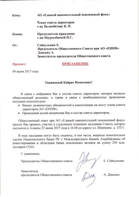 "В связи изменением состава совета директоров АО "ЕНПФ" и возникшими вопросами населения, 09 июня Общественный совет большинством голосов принял решение пригласить нового члена Келимбетова Кайрата Нематовича на очередное заседание, которое состоится 23 июня 2017 года. Указанное приглашение направлено адресатам", - сообщил глава Общественного совета при ЕНПФ Евгений Сейпульник.