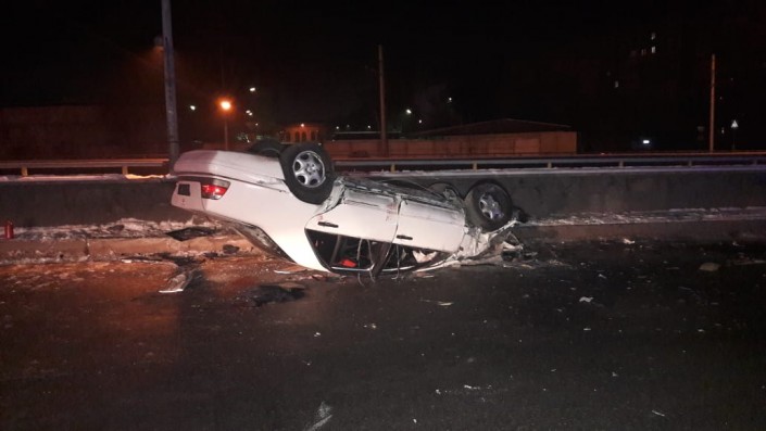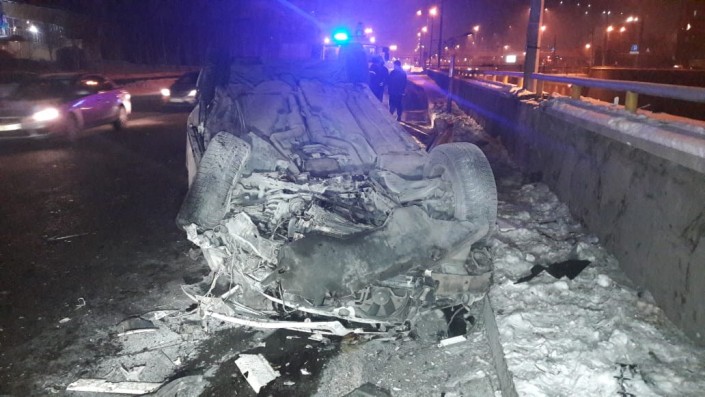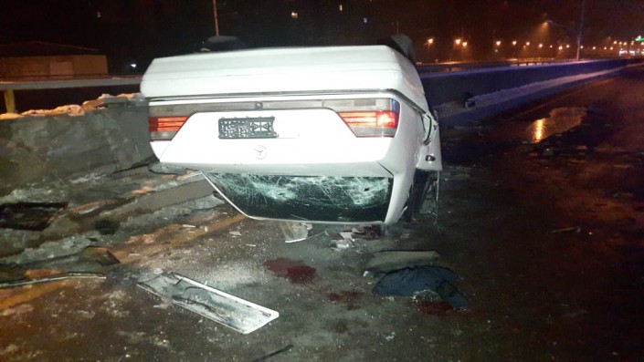 Авария произошла на пересечении улиц Кабдолова и Саина. По словам очевидцев, водитель Mercedes, двигавшийся на запад по Кабдолова, не справился с управлением и на полном ходу врезался в бетонное ограждение. От удара автомобиль перевернулся.