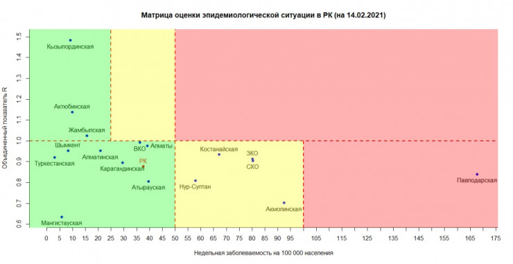 В "красной" зоне по коронавирусу, согласно матрице эпидемиологической ситуации на 14 февраля, остается только одна область - Павлодарская, передает корреспондент Tengrinews.kz.