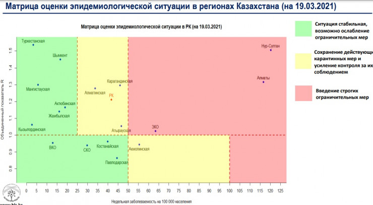 Вчера, 18 марта, матрица оценки эпидситуации в Казахстане выглядела так: