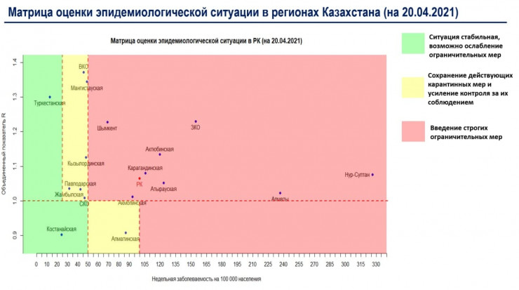 В "зеленой" зоне находятся Костанайская и Туркестанская области.