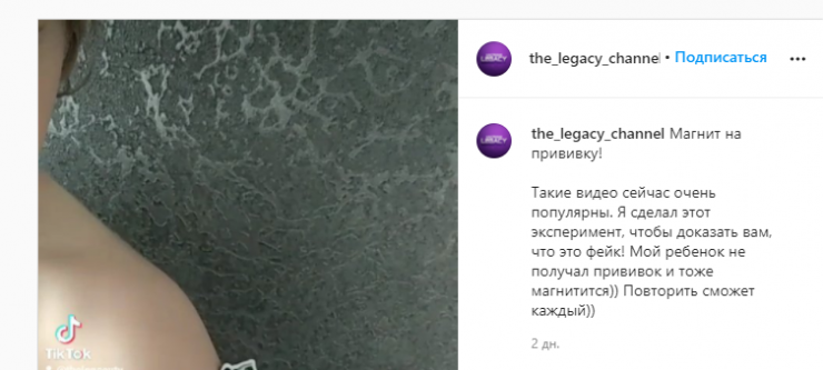 Сама ссылка на видео о притягивающемся к месту укола магните рассылается без каких-либо подписей и пояснений. На самом же деле на странице у автора видео размещен другой ролик, в котором говорится о том, что видео с магнитом – фейк, созданный специально для того, чтобы люди учились отличать достоверную информацию от ложной", - резюмируют журналисты.