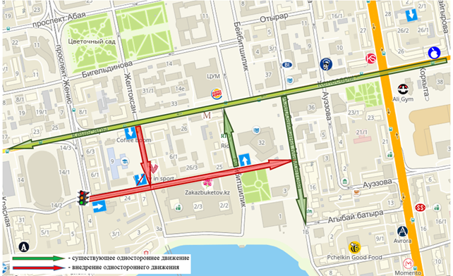 Одностороннее движение планируется ввести на участках по улице Бухарбай батыра от проспекта Женис до улицы Азербайжана Мамбетова и по улице Желтоксан от улицы Кенесары до улицы Бухарбай батыра.