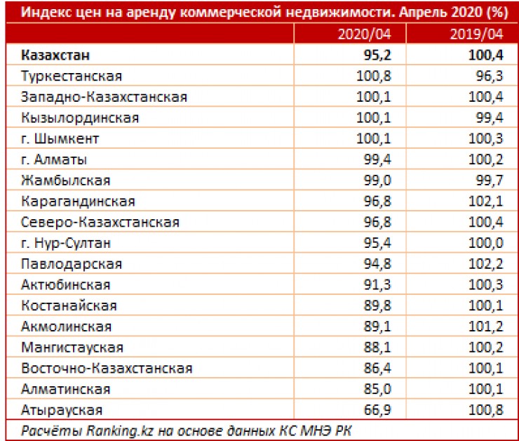 В апреле 2020 года цена на аренду коммерческой недвижимости упала на 5,1 процента по сравнению с мартом 2020 года и на 4,8 процента по сравнению с апрелем 2019 года, передает Tengrinews.kz со ссылкой на Ranking.kz.