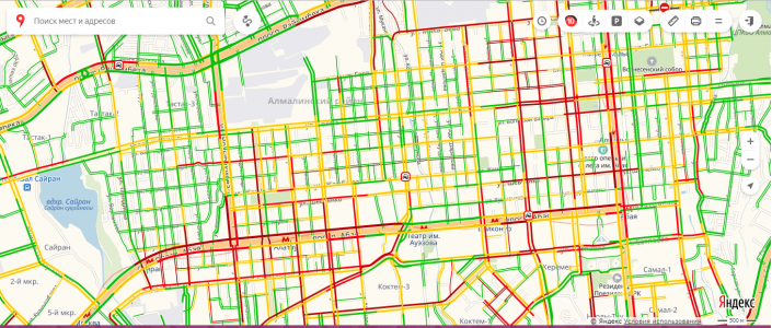 Заторы образовались на главных улицах города: проспектах Абая, Аль-Фараби, Сейфуллина, Райымбека, а также на улицах Толе би, Розыбакиева, Сатпаева, Момышулы.