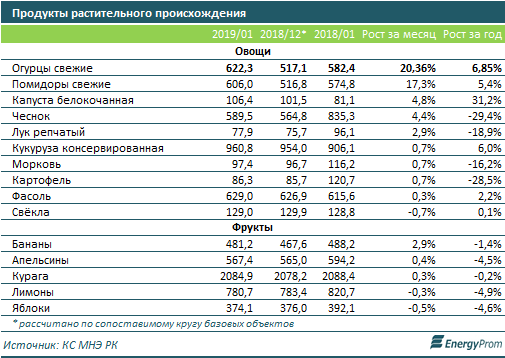 За январь 2019 года серьезно увеличились цены на несезонные свежие овощи - огурцы (+20,4 процента за месяц) и помидоры (+17,3 процента). Также выросли цены на капусту (+4,8 процента), чеснок (+4,4 процента) и лук (почти +3 процента). Цены на "зимние" овощи длительного хранения - картофель, морковь, фасоль - выросли менее чем на 1 процент за месяц. Упала в цене лишь свекла. Среди фруктов заметно подорожали бананы - на 2,9 процента за месяц, а цены на яблоки и лимоны сократились, впрочем, лишь менее чем на 1 процент за месяц.