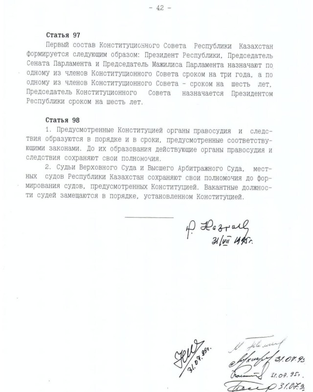 1 августа 1995 года в республиканских средствах массовой информации был опубликован проект Конституции РК, дополненный и измененный с учетом его всенародного обсуждения. Спустя месяц, 30 августа 1995 года, состоялся общенациональный референдум по вопросу: "Принимаете ли вы новую Конституцию Республики Казахстан, проект которой опубликован в прессе 1 августа?".