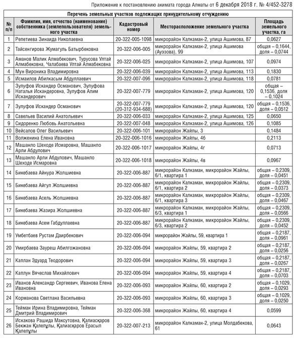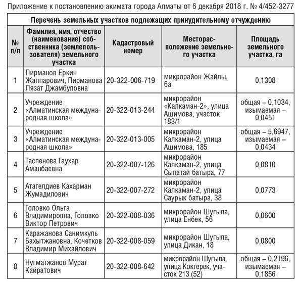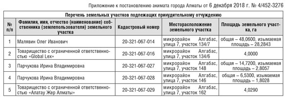 По всем вопросам собственники изымаемых земель могут обратиться в исполнительный орган - Управление земельных отношений Алматы (УЗО) по адресу: улица Толе би, 155, кабинет 514.