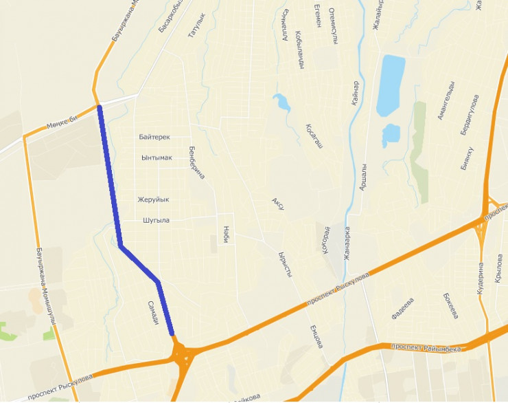 Позже стало известно, что улица Саина будет длиннее. Ее будут пробивать на три километра от проспекта Рыскулова до улицы Монке би. Далее она должна соединиться с магистралью, которая ведет в сторону Бурундайской трассы.