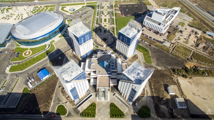 Между 14-этажными жилыми зданиями расположен главный административный центр - операционный блок, в котором во время Универсиады будет располагаться офис организаторов FISU, столовая, рассчитанная на обслуживание 1 000 человек, зона отдыха. Здесь организован музей традиционных музыкальных инструментов с использованием интерактивных технологий.