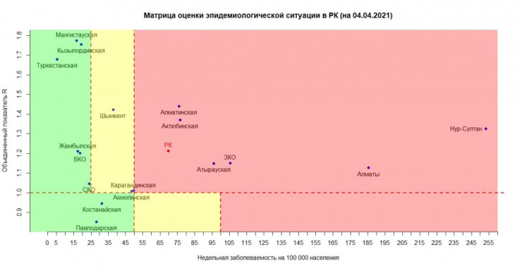 Матрица оценки эпидемиологической ситуации в регионах Казахстана на 4 апреля 2021 года.