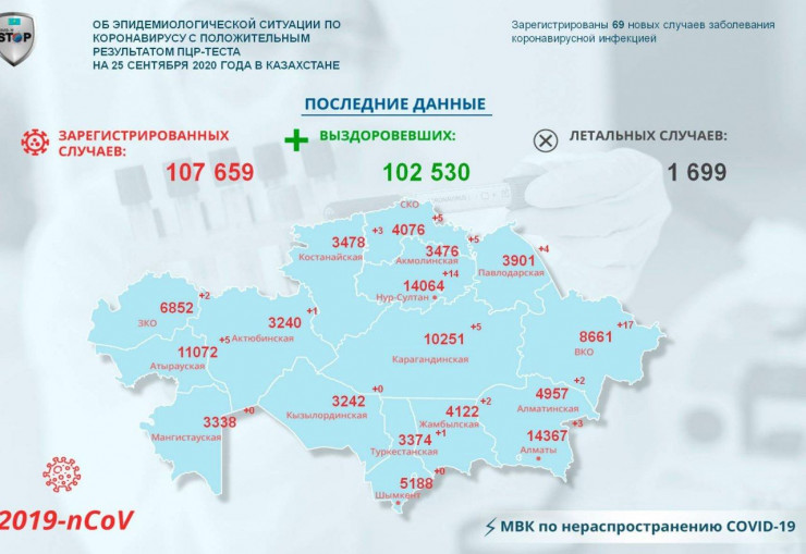 За прошедшие сутки (по данным на 25 сентября) в Казахстане зарегистрированы 69 новых случаев заболевания коронавирусной инфекцией, сообщает Tengrinews.kz со ссылкой на МВК по нераспространению COVID-19.