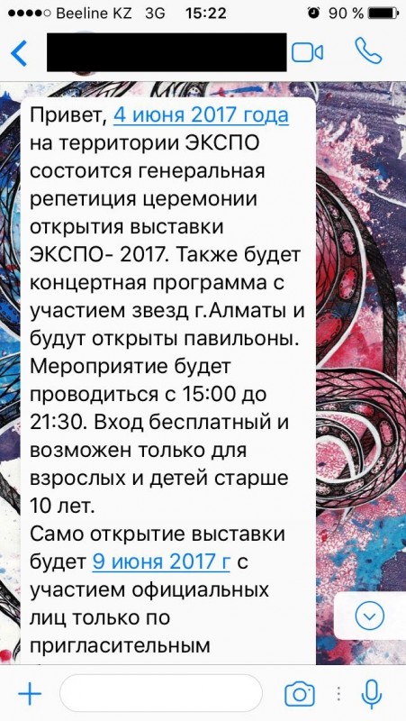 АО "НК "Астана ЭКСПО-2017" ищет распространителей ложного сообщения в WhatsApp об открытии выставки 4 июня. Об этом стало известно корреспонденту Tengrinews.kz