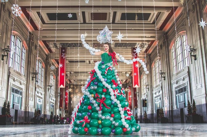 Американка Молли Муньян сшила платье-елку из воздушных шаров. Как сообщает телеканал ABC, на творение высотой более двух с половиной метров женщине потребовалось 590 шариков.
