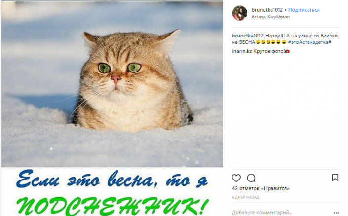 Весна в Астане никак не вступит в свои права. Жители столицы шутят о затяжной зиме в социальных сетях. Редакция Tengrinews.kz собрала публикации, посвященные погоде в Астане.