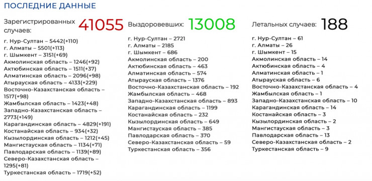 Общее число инфицированных с начала эпидемии в Казахстане выросло до 41 065. При этом 13 008 выздоровели, а 188 - скончались.