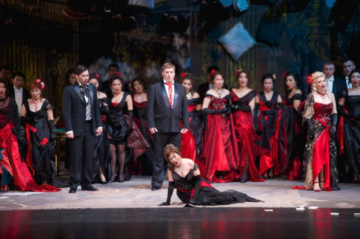 На подмостках столичного оперного театра также собрались яркие звезды театра - оперная дива, лучшая исполнительница партии Виолетты Марина Ребека из Латвии, дирижер и прославленный маэстро из США Юджин Кон. Партию возлюбленного Виолетты Альфредо Жермона исполнил заслуженный деятель Казахстана Медет Чотабаев, являющийся одним из самых востребованных казахстанских артистов за рубежом. Поклонники театрального искусства с нетерпением ждали появления на сцене испанского оперного певца, баритона Пласидо Доминго, которого встретили шквалом аплодисментов.
