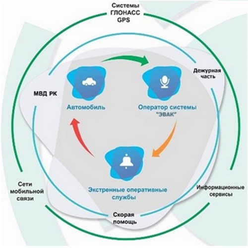 В целом работа системы "ЭВАК" выглядит следующим образом: Небольшое встроенное в автомобиль устройство срабатывает во время ДТП при ударе. Автоматически, по сотовой сети, координаты местонахождения машины передаются в центр единой дежурно-диспетчерской службы "112. Также устанавливается голосовая связь. Диспетчер узнает у водителя подробности случившегося. Если ответа не последовало, то на место автоматически отправляются службы экстренного реагирования. Также на устройстве имеется кнопка SOS, с помощью которой водитель сам может выйти на связь с оператором в экстренной ситуации.