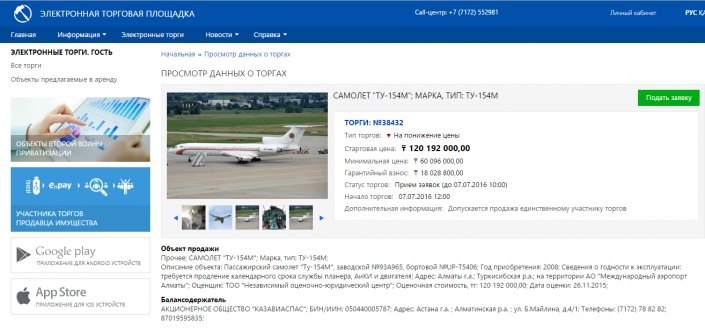 В объявлении указан тип торгов - на понижение цены. Стартовая стоимость самолета - 120 миллионов 192 тысяч тенге. Гарантийный взнос составляет 18 миллионов 028 тысяч 800 тенге. Торги назначены на 7 июля этого года. В информации указано, что допускается продажа самолета единственному участнику торгов.