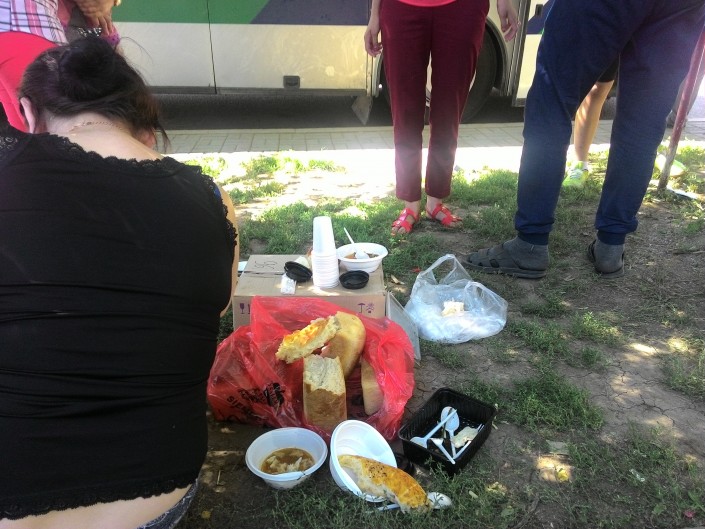 Все это время людям приходится принимать пищу и мыться прямо на улице. В душном автобусе находиться уже фактически невозможно.