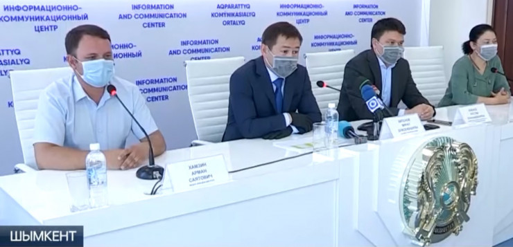 Врач скорой Арман Хамзин (крайний слева) на специальном брифинге. Аким Шымкента Мурат Айтенов (второй слева). Кадр из видео телеканала "Хабар 24"