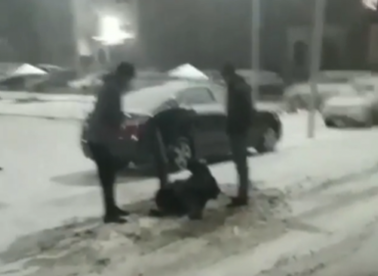 На кадрах видео запечатлено, как мужчина бьет лежащего на снегу человека, а в нескольких метрах виден горящий автомобиль. "Машину поджег", - сообщает автор видео.