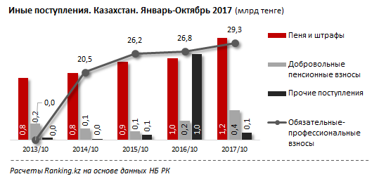 Почти весь объем приходится на обязательные профессиональные взносы - 29,3 миллиарда тенге, рост за год на 9,6 процента (2,6 миллиарда тенге).