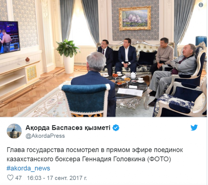В 2017 году Акорда опубликовала фотографию, где Нурсултан Назарбаев во время своего государственного визита в Узбекистан смотрит бой между казахстанцем Геннадием Головкиным и мексиканцем Саулем "Канело" Альваресом.