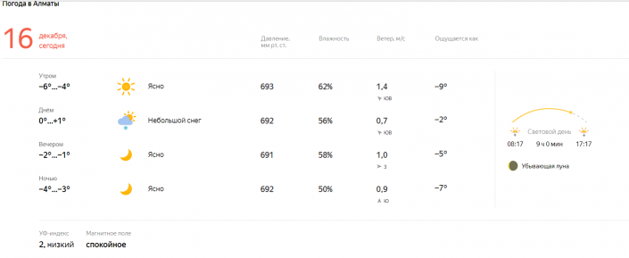Yandex.kz дает прогноз о температуре плюс один градус и небольшом снеге.