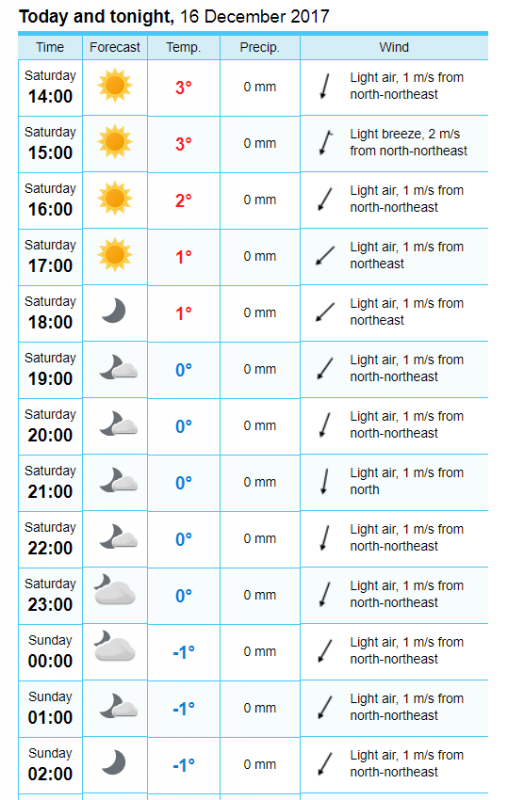 Портал Yr.no сообщает о температуре 3 градуса тепла по состоянию на 14.00. Температура выше и около нуля прогнозируется до 23.00 субботы.
