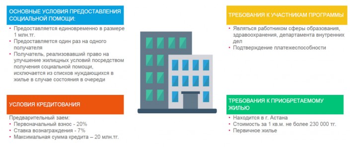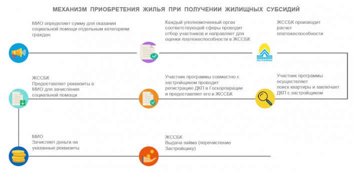 Механизм реализации программы прост: акимат определяет сумму для оказания социальной помощи отдельным категориям граждан, работающих в государственных структурах. Далее каждый уполномоченный орган соответствующей сферы проводит отбор участников и направляет для оценки платежеспособности в "Жилстройсбербанк". Банк производит расчет платежеспособности, и в случае подтверждения предоставляет реквизиты в акимат для зачисления социальной помощи. Участник программы совместно с застройщиком, проводит регистрацию договора купли-продажи (ДКП) в гос корпорации и предоставляет его в ЖССБК, а также осуществляет поиск квартиры и заключает ДКП с застройщиком. Потом акимат зачисляет деньги на указные банком реквизиты, и банк выдает заем. Деньги перечисляются застройщику.