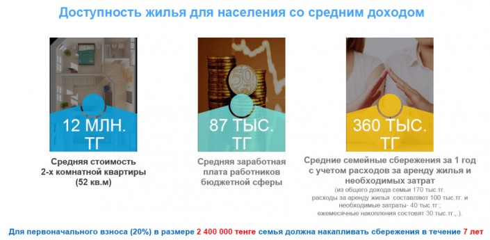 "Расчет по займу "7-20-25" таков. Например, если жилье стоит 12 миллионов тенге, то 20 процентов первоначального взноса составит 2,4 миллиона тенге. А у заемщика собственные сбережения составляют 1,4 миллиона тенге. Недостающую сумму в миллион тенге работник может получить по данной программе. С учетом того, что общий срок кредитования составляет 19 лет, получатель первые 8 лет будет платить 107 440 тенге (ежемесячный платеж под 7 процентов), а последующие 11 лет он будет платить по 55 685 тенге (ежемесячный платеж под 3,8 процента)", - пояснили в акимате.
