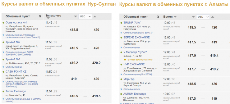 Сейчас, по данным kurs.kz, доллар в обменниках Нур-Султана продают за 419,5-420,2 тенге, покупают за 418,5-419,2 тенге. В обменных пунктах Алматы продажа сложилась на уровне 419-420, покупка - 417,5-418,5 тенге.