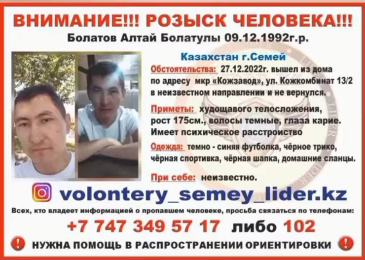 "27 декабря в полицию обратился 70-летний житель города с просьбой найти его сына Алтая Болатова 1992 года рождения. Сотрудники полиции проводят оперативно-разыскные мероприятия по установлению его местонахождения. Ежедневно в розыске мужчины задействовано около 30 сотрудников. Поисковые мероприятия проводятся в районах Затон и Мирный. Мужчина может не осознавать, что у него психическое расстройство," - сообщили в Департаменте полиции области Абай.
