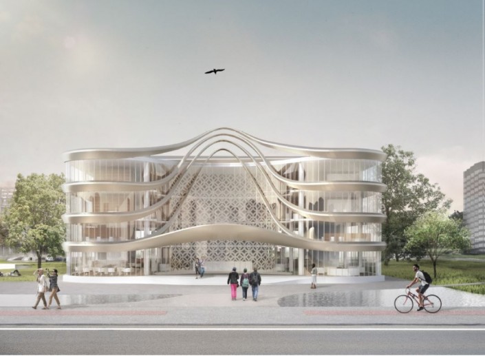 Областная научно-универсальная библиотека. Ее строит акимат Шымкента. Внешне здание площадью 2 600 квадратных метров напоминает книжные страницы.