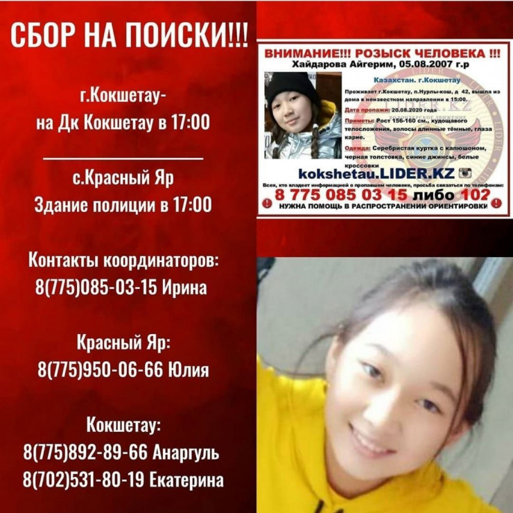 Всех, кто владеет хоть какой-то информацией об Айгерим, просят сообщить на номер 8 775 085 03 15 либо 102.