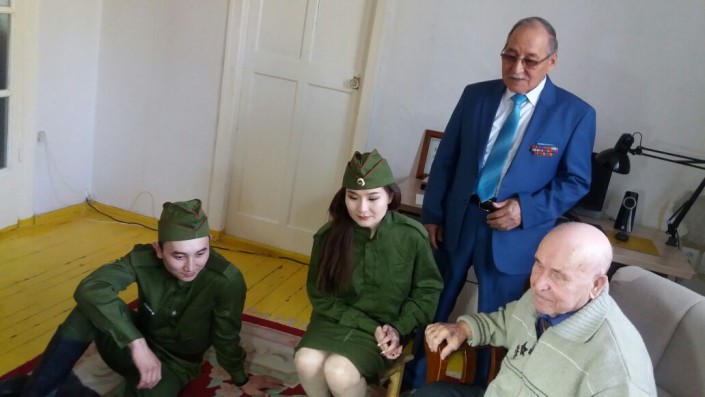 Услышав песни за окном, участник ВОВ Рахимов Курмат Рахимович, поспешил надеть свой парадный китель с медалями и выйти во двор. Ветеран был удивлен, хотя не скрывал, что ждал поздравление от своих бывших коллег.