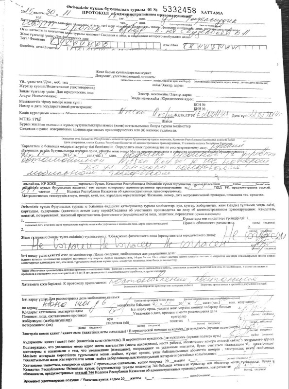 "За несколько месяцев мы наказали более 100 сотрудников полиции по Казахстану, которые нарушали правила дорожного движения. (...) По моему мнению, теперь на меня объявили "охоту". Целый день в ЦОУ следили за моей машиной и выявили якобы четыре нарушения. Протоколы мне выписали", - пояснил Кусаинов. Он направил корреспонденту документы, которые свидетельствуют о том, что некоторые сотрудники полиции были оштрафованы, а также выписанные ему протоколы. Вот один из четырех: