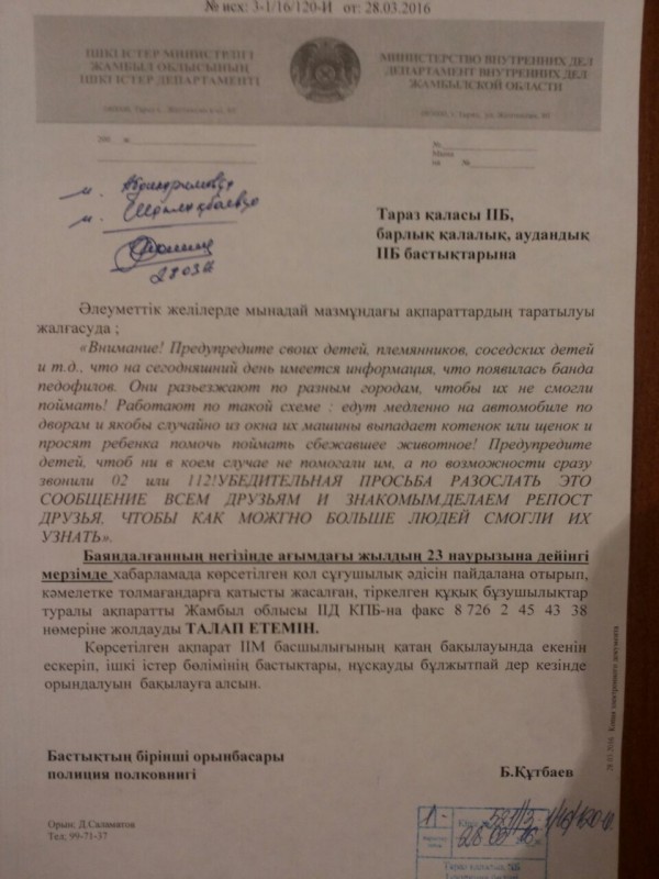 Ранее в Таразе посредством мессенджера WhatsApp было распространено фото служебного документа. Позже документ попал и в социальные сети. В нем говорится о некой банде педофилов, которая якобы орудует в регионе. В WhatsApp шла рассылка о том, чтобы родители внимательно присматривали за детьми и предупредили их об опасности.