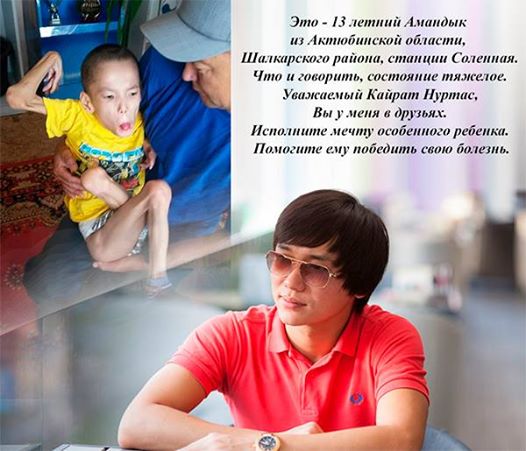 Уважаемый Кайрат Нуртас, Вы у меня в друзьях. Исполните мечту особенного ребенка. Помогите ему победить свою болезнь. Я слышал, что Вы добрый и отзывчивый. И уверен, откликнитесь. Маленький, особенный мальчик с ДЦП из станции Соленная, будет ждать от Вас весточки, Кайрат. P.S. мы сделаем все возможное, чтобы Амандык дождался своего кумира", - написал пользователь (орфография и пунктуация сохранены).