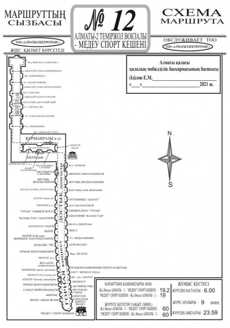 Сообщается, что автобус № 12 будет ехать от горнолыжного комплекса, поворачивать налево по проспекту Абая, потом двигаться по проспекту Абылай хана до железнодорожного вокзала Алматы-2. В обратную сторону - по проспекту Абылай хана, далее по улице Курмангазы до проспекта Достык.