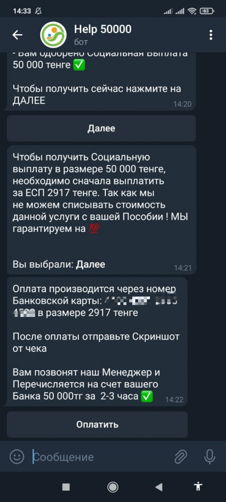 Сообщается, что получить выплату казахстанцам предлагают при помощи чат-бота в мессенджере Telegram. Для этого необходимо отправить якобы единый совокупный платеж в размере 2 917 тенге на указанный номер банковской карты. После этого гражданам обещают "100-процентную гарантию" получения выплат.