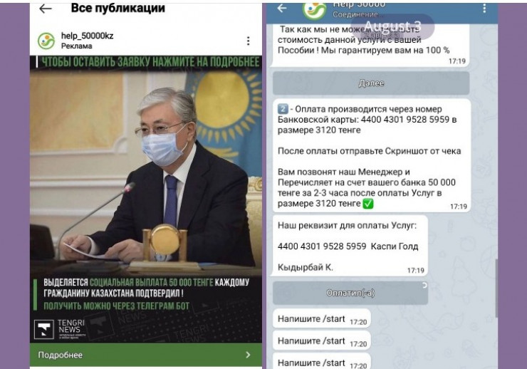 Каждый раз пользователям "гарантируют на 100 процентов" выплату соцпособия в размере 50 тысяч тенге. Ссылка ведет в Telegram-bot, в нем заявителя просят перевести 3 120 тенге на карточный счет в банке. Это якобы оплата услуги.