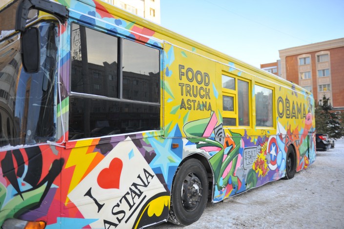 Жители Астаны увидели необычный автобус с изображением президента США Барака Обамы в конце прошлого года. Владелец автобуса - молодой столичный предприниматель Нурсултан Шарипбаев обещает открыть фуд-трак до конца недели. До весны он планирует открыть еще два таких автобуса.